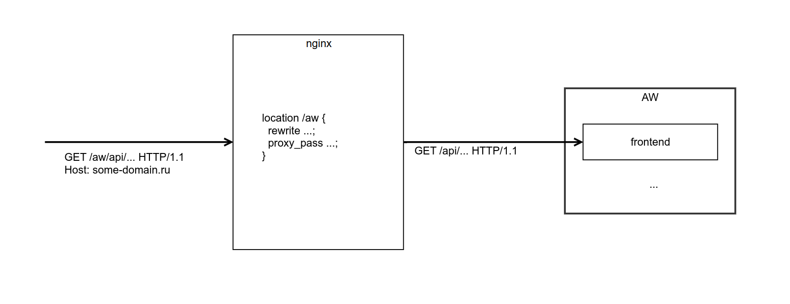 В AW запросы должны поступать без префикса пути в URL, т.е., например, запрос к "https://aw-demo.ru/aw" должен переписываться в виде "http://aw-demo.ru/", а запрос к "https://aw-demo.ru/aw/api/some/path" должен переписываться в виде "http://aw-demo.ru/api/some/path".