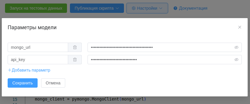 Зачастую, в исходном коде скрипта необходимо указать чувствительные параметры (API ключей к внешним сервисам, строк подключения к БД и т.п.). Для того чтобы не прописывать эти значения напрямую в скрипте, можно использовать хранилище параметров модели.
