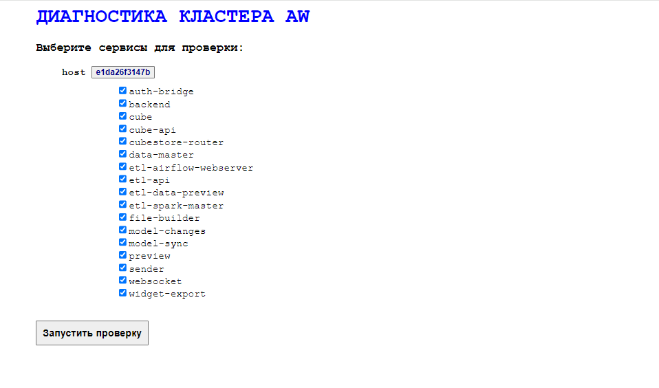 Утилита AW-Check предназначена для диагностики микросервисов, входящих в состав развернутого программного кластера AW. Данная утилита предоставляет возможность проверки корректного запуска и состояния микросервисов AW. Таким образом, она рассматривается как средство начального тестирования, производимого на первом этапе комплексной проверки кластера на готовность к работе.