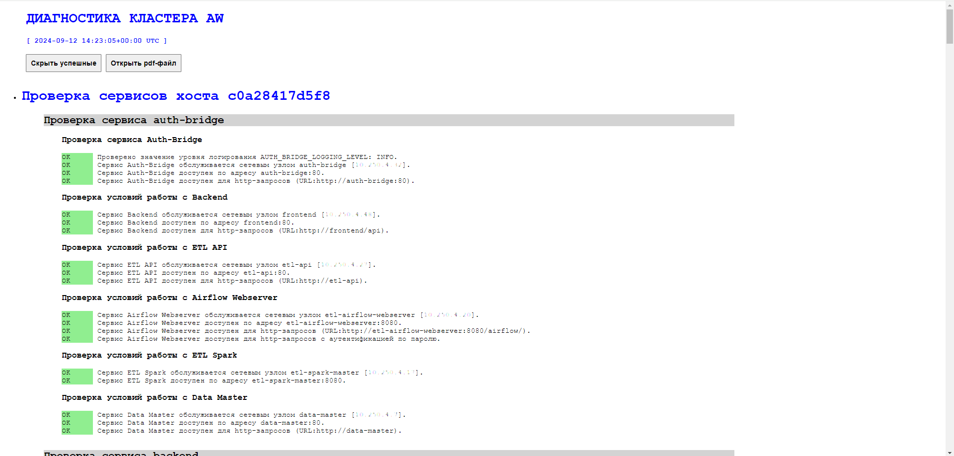 Некоторые сервисы AW имеют логически связанное или взаимно дополняющее прикладное значение. Поэтому в некоторых случаях удобно рассматривать сервисы AW как элементы программного комплекса, разбитые по нескольким группам с учетом их прикладного контекста. В связи с этим может возникать потребность раздельной диагностики условно выделенных таким образом групп. Исходя из этих соображений, утилита позволяет запускать диагностики для конкретной группы или перечня групп сервисов кластера AW. Для указания нужной группы используется опция -- group. Например, следующая команда запустит диагностику для групп etl и backend: